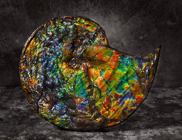 Канадский аммолит — это многоцветный, иризирующий драгоценный камень, добываемый в Канаде. Этот органический камень, напоминающий опал, представляет собой окаменевшую раковину вымершего моллюска, называемого аммонитом.